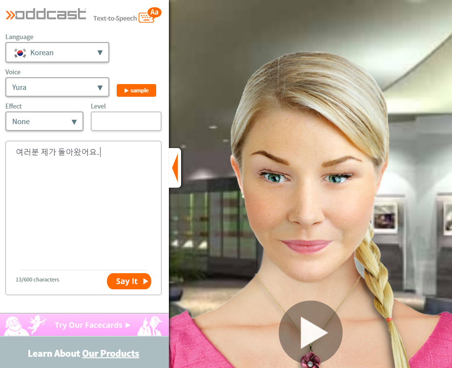 영어 뿐 아니라 한국어 등 다양한 나라의 언어를 지원한다. 한국인 목소리도 다양해서 쓰임이 좀 있지 않을까 싶다.(녹음과 저장에 대해서는 하단에서 설명)